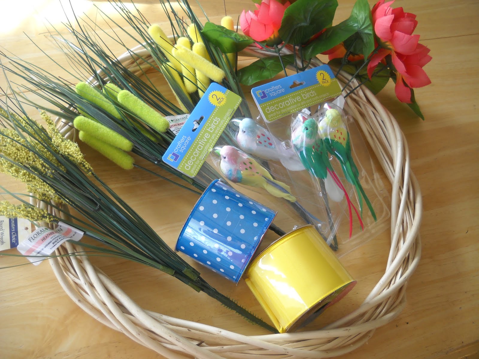 I’m a product of the 80’s and there’s nothing I can do about it. It’s in my genes. I like my hair big, my music loud, my jeans tight, my soda caffeinated, and my wreaths FAT and FLUFFY. That being said, here’s the new spring wreath I made for my front door:  It’s big, it’s fat, and, oh… it’s bright. But I deserve some credit—it isn’t spray painted neon pink (yet) and it isn’t wearing shoulder pads. So there may be some hope for me..sometime…in the distant future…. Anyways, here are the supplies I used. (Minus the yellow spray paint I had in the garage.) And all of them came from Dollar Tree (our local dollar store) which made for a really inexpensive wreath. (Which is what I need with all the rain and wind my front door is exposed to.)